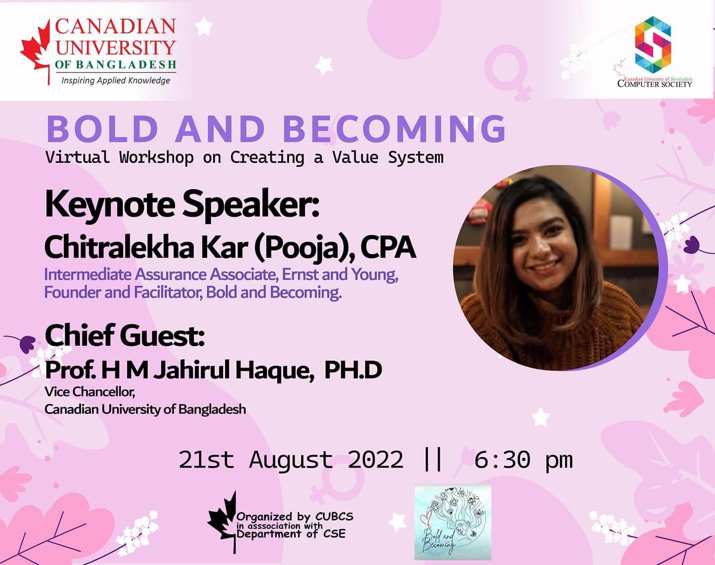 On 21st August 2022, CUB Computer Society in association with Department of CSE is organising “Workshop on Creating a Value System by Bold and Becoming” where Chitralekha Kar (Pooja), Founder and Facilitator of “Bold and Becoming” will be seen discussing on how to create a strong and dynamic network of women (and youths), to help girls and women to cultivate confidence, courage, self-respect, self-love and self worth.